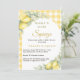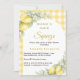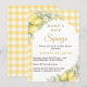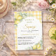 Celebre o seu próximo pacote de alegria com este elegante convite de chá de bebê temático de limão. Com um fundo gingham amarelo suave e branco, delicados limões em aquarela e folhagens frescas, este design cria uma atmosfera quente e convidativa perfeita para um chá de bebê de verão ou inspirado em cítricos.