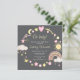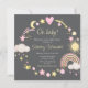 Este convite de baby shower fofo e caprichoso apresenta um arco-íris, nuvens, sol, lua e estrelas em rosa e amarelo sobre um fundo cinza escuro. O texto combina fontes manuscritas e sem serifa para uma aparência elegante e moderna. Isso é perfeito para um baby shower com tema de clima.