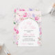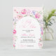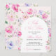 Convite de chuva de bebê com arco floral rosa pastel suave.