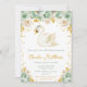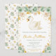 Este convite de chuva de bebê fofo e caprichoso apresenta um cisne elegante e arranjos florais de rosas verdes com confetes de brilho dourado falso. O texto combina fontes manuscritas e sem serifa para uma aparência elegante e moderna. Isso é perfeito para uma chuva de bebê com tema de cisne.