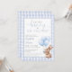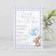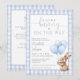 Este convite de chá de bebê encantador apresenta um coelhinho fofo segurando balões e um fundo xadrez azul. Com o código QR do seu registro e detalhes do evento no verso. Criado por Thisisnotme©