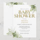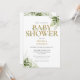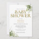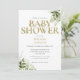Um convite de chuva de bebê neutro em gênero featuring tipografia dourada elegante e folhagem verde botânica bonita. Criado por Thisisnotme©