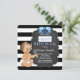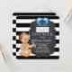 Convite de chuva de bebê com listras pretas com um adorável bebê menino em um belo e ousado fundo de lousa com listras pretas e brancas. Este convite de chuva de bebê com lousa é facilmente personalizado para o seu evento, adicionando seus detalhes no estilo de letra e cor, e na redação de sua escolha.
