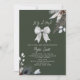 Tema de chuva de bebê menina com botânicos de inverno no canto superior direito e inferior esquerdo. No topo, apresenta ilustração de um laço branco. O fundo é verde escuro.