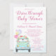 Convites de chuva de bebê drive-thru com adorável carro azul turquesa com flores bonitas, balões e faixa em um fundo azul turquesa. Este convite de chuva de bebê drive-thru é facilmente personalizado com os detalhes do seu evento.