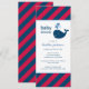 Este convite de chuva de bebê em formato esbelto e náutico apresenta uma baleia naval simpática com respingos de água em forma de coração, contra um design de listras diagonais vermelhas e azuis-navais ousadas. A combinação clássica de cores náuticas é perfeita para uma celebração de bebê menino em um formato de cartão moderno e elegante. Um padrão de listras coordenadas adorna a parte de trás do cartão. Todas as palavras são totalmente personalizáveis para o seu evento.