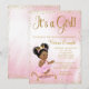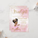 Convite de chuva de bebê rosa e dourado com adorável bebê africana com cabelo afro fofo e tutu rosa e travesseiro em um fundo brilhante rosa e dourado. Este convite de chuva de bebê princesa rosa e dourado é facilmente personalizado para o seu evento, basta adicionar seus detalhes.