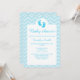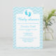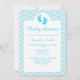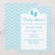 Este convite de chuva de bebê azul elegante apresenta silhuetas de pegadas de bebê fofas na cor azul. A cor do fundo é azul suave com um padrão de chevron / zigue-zague leve.