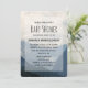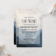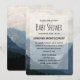 Um convite de chá de bebê com uma fotografia de belas montanhas, um céu nublado e colinas onduladas cheias de árvores em primeiro plano. Esquema de cores azul cinza.