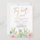 Convite moderno de chuveiro de casal taco 'bout love com falsa caligrafia em rose gold apresentando um arranjo de cacto florido cor de rosa, alguma textura de aquarela rosa.