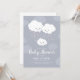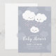 Personalize este convite de chá de bebê moderno e elegante para casais com uma família de nuvens fofas, composta por três nuvens brancas: pai, mãe e uma bebê, onde os orgulhosos pais nuvens estão banhando seu bebê com uma chuva de corações cor-de-rosa em um céu cinza quente.