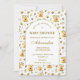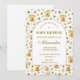 Um design quente e encantador com delicadas abelhas, colmeias douradas e folhagens botânicas suaves dispostas em um padrão leve e arejado. A paleta neutra suave combinada com o layout arqueado elegante cria uma estética doce e convidativa que se sente ao mesmo tempo lúdica e refinada, perfeita para um chá de bebê inspirado na natureza com um toque suave de livro de histórias.