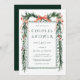 Este convite elegante de chá de bebê de casal apresenta uma grinalda de pinheiro de Natal em aquarela decorada com fitas vermelhas, frutos de azevinho, folhagens botânicas e caligrafia estilosa. Para personalização mais avançada deste design, clique no link "Personalizar ainda mais".