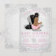 Convites de chá de bebê com floco de neve no inverno para meninas com adorável bebê afro-americana e sapatos de salto alto prateados em um lindo fundo de diamantes e flocos de neve no inverno. Esses convites de chá de bebê elegantes e prateados com tons de rosa são facilmente personalizados para o seu evento, basta adicionar seus detalhes.