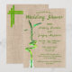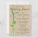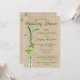 Este convite de chuva de noiva rústico em formato vertical apresenta um caule de bambu sortudo espiralado na frente com os detalhes do modelo do partido em uma lona rústica ao fundo. O canto superior esquerdo traseiro tem caules de bambu duplos entrelaçados e folhas de bambu estão no canto inferior direito. Personalize o texto nos campos do modelo ou edite usando a ferramenta de design para selecionar um estilo de fonte, tamanho e cor que preferir.