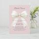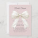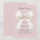 Organize uma celebração sofisticada com este convite de noivado romântico em cor-de-rosa desbotado. O design apresenta um grande laço ilustrativo em marfim adornado com delicadas pérolas contra um fundo suave rosa. Este convite elegante é perfeito para a noiva feminina que ama detalhes clássicos e elegantes. Personalize e adicione um nome e detalhes da festa.