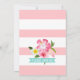 Um convite de chuva de presentes de noivado divertido e festivo com um flamingo rosa cercado por flores tropicais de hibisco, flores de plumeria e folhas de palmeira exuberantes em um fundo aqua brilhante. O design divertido inspirado na ilha é perfeito para uma celebração de verão ou destino. O verso apresenta um fundo listrado de rosa e branco com um acento floral tropical. Todo o texto é totalmente editável para o seu evento.