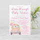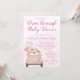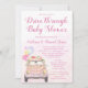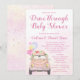 Convites de chuva de presentes para bebê drive by covid com adorável carro rosa com flores bonitas, balões e faixa em um fundo rosa. Este convite de chuva de presentes para bebê drive by é facilmente personalizado com os detalhes do seu evento.