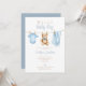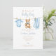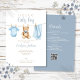 Este convite de chá de bebê fofo apresenta uma linda linha de roupas de bebê menino azul e pode ser personalizado com seus detalhes em tipografia elegante. O verso apresenta os detalhes do seu evento e código QR do registro. Criado por Thisisnotme©