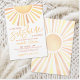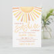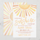 Celebre a chegada iminente com este convite de chá de bebê ensolarado, brilhante e alegre. No topo, um grande sol com raios vibrantes em tons de amarelo, laranja e vermelho define o tom para uma celebração alegre. A frase "Um pequeno raio de sol está a caminho!" é exibida em uma mistura divertida de fontes modernas e tipografia em negrito. A parte inferior do convite inclui todos os detalhes do evento, estilizados em uma combinação de estilos de fonte e cores quentes inspiradas no sol - amarelo, laranja e vermelho - para combinar com os raios do sol.