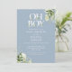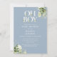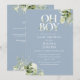 Convite de baby shower oh boy com código QR do seu registro e todos os detalhes da festa de bebê em tipografia elegante e folhagem botânica em verde em um fundo azul poeirento. Projetado por Thisisnotme©