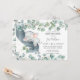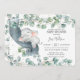 Personalize este convite de chuveiro de bebê chique com os detalhes do seu bebê de forma fácil e rápida, basta pressionar o botão personalizar para reorganizar e formatar o estilo e a colocação do texto. Este convite caprichoso apresenta folhas de eucalipto em aquarela rústica e um adorável elefante bebê dormindo. Perfeito para dar as boas-vindas ao seu novo bebê. Itens correspondentes disponíveis na loja! (c) The Happy Cat Studio.