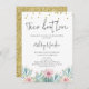 Convite de chuveiro de casais taco de amor com caligrafia moderna, apresentando um arranjo adorável de cacto florido rosa, algumas bolinhas de ouro falso e fundo com glitter dourado falso.