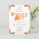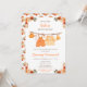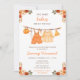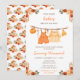 Este convite de chuveiro de bebê aquarela fofo e caprichoso apresenta uma linha de roupas de bebê com arranjos florais laranja. O texto combina fontes manuscritas e sem serifa para um visual elegante e moderno. Isso é perfeito para um chuveiro de bebê de outono.