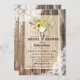 Convite de chuveiro de noiva country rústico com design de buquê de girassol sobre crânio de longhorn com fundo de tábuas de madeira de celeiro e renda branca e uma gravação de coração com monograma e girassóis.