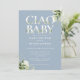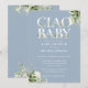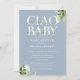 Convite ao chá de fraldas Ciao com elegante e bonito tipografia foliar botânica e verde sobre fundo azul empoeirado. Projetado por Thisnotme©