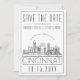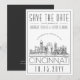 Um convite de casamento único "Save the date" para um casamento que acontecerá na bela cidade de Cincinnati, Ohio. Este convite apresenta uma ilustração estilizada da paisagem urbana única da cidade com seu nome abaixo. Isso é seguido pelas informações do seu dia de casamento em um estilo de linha aberta correspondente. No verso do convite há uma cor cinza escuro para complementar a aparência e a sensação. Todos os elementos individuais do cartão de convite são desbloqueados para que você se sinta à vontade para alterar quaisquer detalhes necessários, como tamanhos de fonte, estilos e muito mais, usando a função de personalização. Você pode adicionar uma foto ao verso e aplicar um filtro preto e branco a ela. Divirta-se sendo criativo e tornando-o seu!