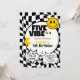 Cinco é um Vibe | Rapazes 5 Retro Convite de aniversário Comemora um marco com o nosso convite de festas "Cinco é a Vibe", projetado especificamente para rapazes que fazem cinco anos. Este convite apresenta uma tipografia retrô de groovy combinada com padrões na moda preto e branco, criando uma estética divertida e vibrante que captura a essência de uma celebração viva. Perfeito para festa de aniversário, este convite define o tom de um evento inesquecível cheio de alegria e entusiasmo.