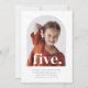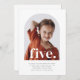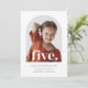 Um simples convite de Aniversário para 5, com sua própria foto em forma de arco e as palavras 'cinco' no topo.