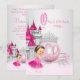 Convite de aniversário da Cinderela com carruagem de princesa com diamantes rosa e prata e fundo de castelo com linda menina morena vestindo um lindo vestido rosa com tiara de diamantes e pérolas. Este convite de aniversário de princesa "era uma vez" rosa e prata da Cinderela para meninas de qualquer idade é facilmente personalizado para o seu evento, basta adicionar seus detalhes no estilo de letra e cor, e texto de sua escolha. Este é um design impresso sem brilho real, diamantes, pérolas, etc.