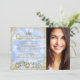 A princesa Quinceanera convida com um belo cavalo de diamante de ouro e carruagem num brilho de ouro e faísca de diamante Cinderela azul. Esta bela princesa do conto de fadas de fotos Quinceanera convida facilmente para o seu evento simplesmente adicionando sua foto e detalhes no estilo de fonte e na redação de sua escolha. Este é um design impresso sem diamantes reais, brilho, etc.