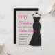 Um convite de aniversário de 50 anos moderno e elegante, preto, rosa vibrante e glitter prateado que você pode personalizar e enviar para a celebração do seu aniversário de cinquenta anos. As palavras "Cinquenta e Fantástico" estão definidas em um fundo glitter prateado, com uma tipografia de letra cursiva rosa vibrante e preta, popular e elegante, colocada ao lado de um lindo, sofisticado e glamuroso vestido preto de gala sem alças com glitter. Divirta-se personalizando o nome, data e hora, local e RSVP com a ferramenta de edição.