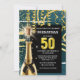 Um ouro falso moderno sobre o design azul-lacre escuro, com uma garrafa de ouro falso de vinho espumante com uma cortiça explosiva; brilhante brilho de ouro e galerias verticais penduradas ao lado de modelos de texto branco a preto, que contém um grande número de 50 em ouro. Estes são ideais para todos os 50/50 anos e comemorações de negócios. Personalize o texto para se adequar ao seu evento.