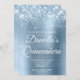Crie seu próprio convite para comemoração de 15 de na moda para sua filha. Gráficos cintilantes azuis claros e decorativos formam uma borda superior. A arte digital de fundo apresenta uma folha de metal piscada brilhante, azul, estilo ombre e brilhante. Personalize a cor do texto branco do convite ou os estilos de fonte. O texto "Quinceañera" também é personalizável. Os faíscas, brilho e folha de luxo serão criados por elementos artísticos que impressão gostam de uma foto.