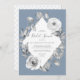 Um elegante e moderno chá de panela floral com um belo arranjo diamante de flores aquáticas em tons cinzas sobre um elegante fundo azul empoeirado. O verso do convite apresenta um delicado padrão de diamante que complementa a forma de diamante na frente.