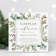 Este convite para chás apresenta cor d'água pintada de eucalipto, folhas verdes, bagas vermelhas, ramificações de pínus, e um quadro quadrado verde com na moda de caligrafia. Para personalização mais avançada deste design, clique no link "Personalizar mais". Itens correspondentes também estão disponíveis.