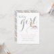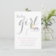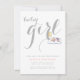 Garota adormecida chá elegante cinza de texto mínimo de tipografia convite com o texto bebê em branco sobre a cinza clara e uma menina em roupas cor-de-rosa com um pouco de azul dormindo em uma nuvem e a lua amarela. Esta moderna tendência na moda e um design minimalista personalizado e fofo é completamente personalizável. Você pode mudar a cor de fundo. Alguns elementos de Trina Clark.