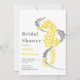 Cinzas de algas marinhas e chás de panela de casamento de praia amarela que apresentam um cavalo marinho amarelo e uma cinza de algas, enquanto o texto "Chá de panela" e o nome da noiva são escritos numa tipografia moderna e ousada. Este modelo é perfeito para um chá de panela de praia de verão. A parte de trás é de cor de cinza sólida.