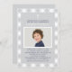 Celebrar a Primeira Comunhão do seu filho com um convite elegante para cartão com fotos para a cerimônia e celebração que se seguirá. Este design clássico apresenta uma foto do seu filho, texto personalizado que pode ser totalmente personalizado, um simples sotaque cruzado branco e um padrão de fundo de xadrez de verificação de gingham em cinzas de platina clara, azul de marinho e esquema de cor branca.