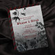 Design de gótico místico, porém refinado e decadente, apresentando um fundo texturizado de cinzas, decorado com um belo arranjo de rosas pretas, pendurando flores silvestres e cultivando eucalipto para enquadrar o convite. A caligrafia vitoriana em vermelho escuro cria um contraste impressionante e enfatiza a estética. Uma faixa diagonal negra angustiada sobre um fundo texturizado vermelho escuro enfeita o lado de trás do convite.