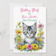 Um gatinho listrado de cinza bonito numa cama de flores amarelas e cor-de-rosa, com convites de festas de aniversários de ilustração de cor-de-água.