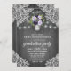 Cinza Roxa de Prata Convite para Festa de formatura Rústica Floral - cinza ou fundo de madeira de vintage prateada/casca rústica com luzes de cordas e rendas florais. O design também apresenta flores elegantes em vários tons de roxo em um pote de maçã prateada que você pode personalizar para as iniciais de sua escolha.