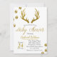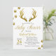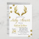 Dourados traços de veados, silhueta e rastros de veados com um convite para chás de fraldas de fundo de planadores de madeira de cinza de luz. Excelente para um chá de tema rústico elegante para uma mãe ser!