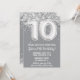 Cinza e convite de 10 anos de Convite de aniversário prateado, 10 anos, com prata branca preta, com escrevendo moderno e balões de folha divertida.