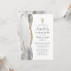 A borda esquerda deste elegante e moderno convite para a primeira comunhão apresenta uma cinza e uma aquarela branca com borda cortada com brilho dourado. Uma cruz de folha falsa de ouro aparece acima do texto personalizável, que combina escrita manual, chapa e fontes itálicas em cinzas de carvão em um fundo branco. O verso apresenta uma cinza correspondente e um design de agate dourado.