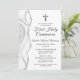 Um maravilhoso e elegante convite da Primeira Sagrada Comunhão com cinza de prata macia, design e agata branca. A paleta de cores sereno e eterno oferece um cenário sofisticado para seu dia especial. Com detalhes delicados e uma sensação luxuosa, esse convite é perfeito para uma jovem celebrando sua Primeira Comunhão Sagrada, oferecendo uma bela mistura de graça e estilo.